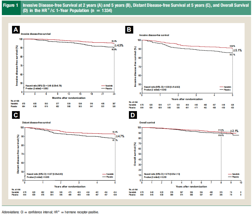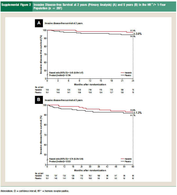 HR+/>1年人群中,奈拉替尼组iDFS率为93.0%(95%CI:86.5%~96.5%),安慰剂组为91.7%(95%CI:85.4%~95.4%),奈拉替尼组绝对获益为1.3%(HR=0.74;95%CI:0.29~1.84)(见Supplemental Figure 2B)。