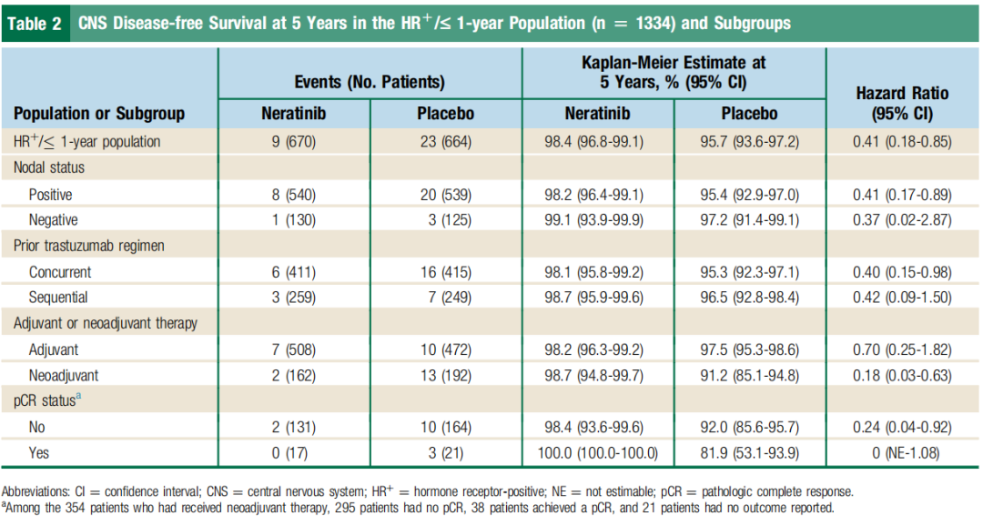 奈拉替尼组5年时首次CNS累积复发率为0.7%,而安慰剂组为2.1%(Table 1)。在5年治疗中,奈拉替尼组中有98.4%(95%CI:96.8%~99.1%)的患者和安慰剂组有95.7%(95%CI,93.6%~97.2%)的患者仍然生存,并且没有CNS复发的报告(CNS-DFS的危险比为0.41;95%CI为0.18~0.85)(Table 2)。