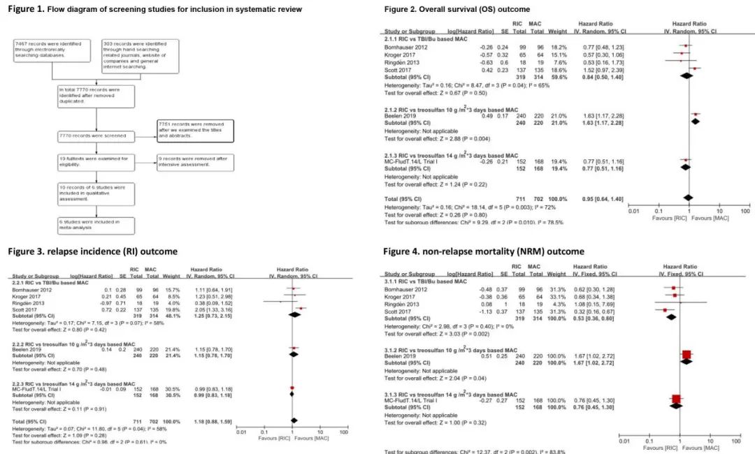 该项系统评价共纳入6项随机对照研究(1413名患者),比较了RIC与MAC,研究结果显示,对于完全缓解的AML和MDS患者,RIC与MAC相比,总生存(OS)相似(HR=0.95,95%可信区间 (CI, 0.64, 1.4), P=0.80),复发率相似(HR=1.18, CI (0.88, 1, 59), P=0.28)。但纳入研究间异质性明显。RIC与全身放疗(TBI)/白消安(Bu)为基础的MAC比较,明显降低了非复发死亡率(NRM)(HR=1.67, CI (1.02, 2.02), P=0.04),各研究间没有异质性。和TBI/Bu为基础的MAC比较,RIC有减少急性移植物抗宿主病(aGVHD)的趋势,但未达到统计学差异(HR=0.61, CI (0.36, 1.04), P=0.07)。RIC和MAC比较,慢性移植物抗宿主病(cGVHD)发病率无差异,但纳入研究间有异质性。当去除其中一个研究后,异质性消失,结果不变。使用RIC方案预处理的患者,植入失败的发生率仍然很低(2.6%),MAC组是1.1%,无统计学差异(HR=2.19, CI (0.96, 5.03), P=0.06)。