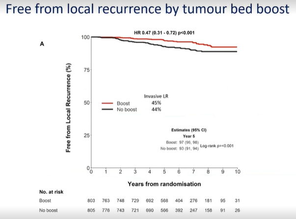 2007年6月至2014年6月,1608例患者被随机分为无局部加量组(805例)和局部加量组(803例)。831例患者接受常规WBI治疗(416例无加量;415名患者加量)。777例患者给予大分割放疗(389例患者无加量,388例患者加量)。无加量组106例(13%)和加量组105例(13%)采用辅助内分泌治疗。平均随访时间为6.6年。无加量组5年无局部复发率为93%,加量组为97%(HR=0.47,95%CI:0.31~0.72,P<0.001)。瘤床加量组的获益与年龄、肿瘤大小、核分级、手术切缘、内分泌治疗与否均无相关性。全乳放疗常规分割与大分割,在五年无局部复发率上没有显著差异(95% vs .95%,P=0.89)。两组之间2级以上的乳房疼痛、皮肤及皮下纤维化大致相仿。