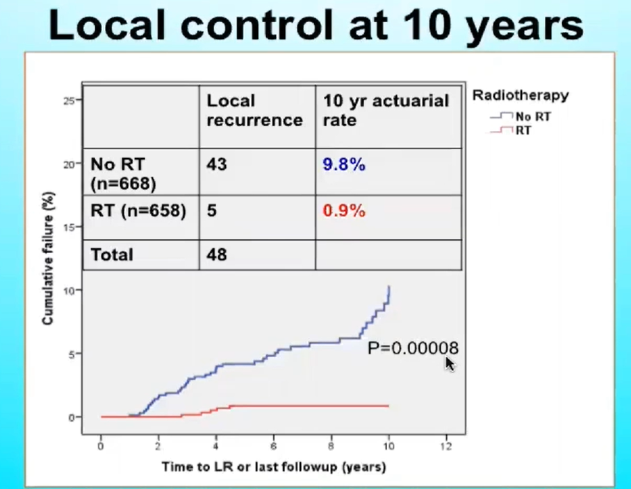 658名接受保乳手术并接受辅助内分泌治疗的患者被随机分配接受全乳照射,另有668名妇女不接受放疗。在中位随访10年后,同侧乳腺肿瘤复发率,未接受放疗和放疗组分别为9.8% vs 0.9%(P=0.0008),但对10年总生存和无转移相关生存无明显影响(80.4% vs 81%,98.1% vs 96.4%),ER高表达组现对于ER低表达组10年局控失败率分别9.8% vs 18.8%(P=0.007),放疗组和非放疗组因乳腺癌的死亡率分别为9%和4%。