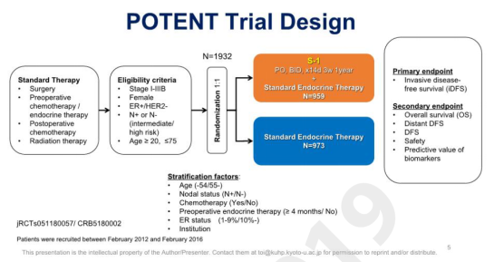 一直以来乳腺癌辅助化疗被蒽环和紫杉类药物占据整个江山,增加药物剂量并不能带来显著的生存获益,而增加不同化疗药物与内分泌治疗联合似乎是一种可选策略。POTENT研究在标准手术、化疗后针对具有中、高危复发风险的人群中一组应用S1联合标准内分泌治疗,一组单独标准内分泌治疗进行比较,在S1联合内分泌治疗组5年iDFS达86.9%,单纯内分泌iDFS为81.6%,两者比较有统计学差异,让人们看到高危复发风险的HR+乳腺癌内分泌+化疗是一种可选策略,不过根据这一结果推广至临床为时尚早,需要客观谨慎对待。