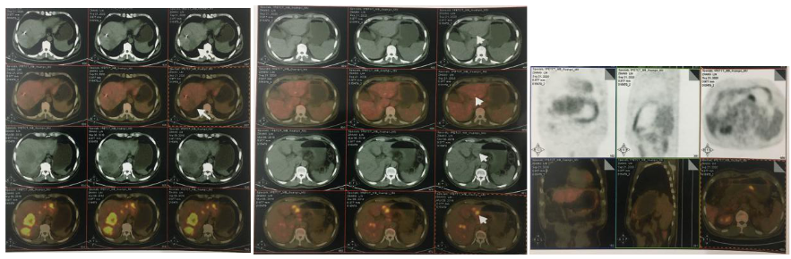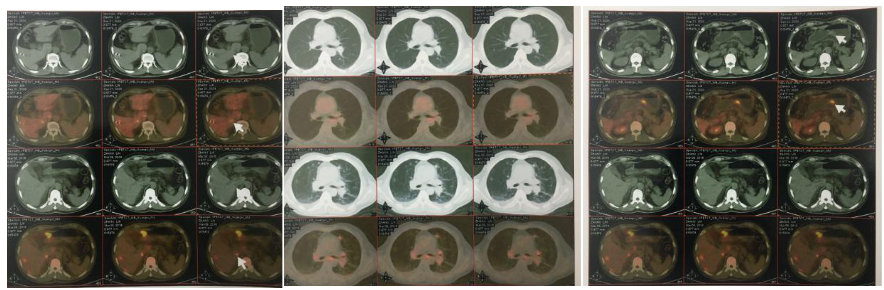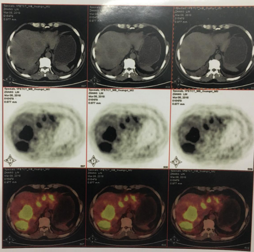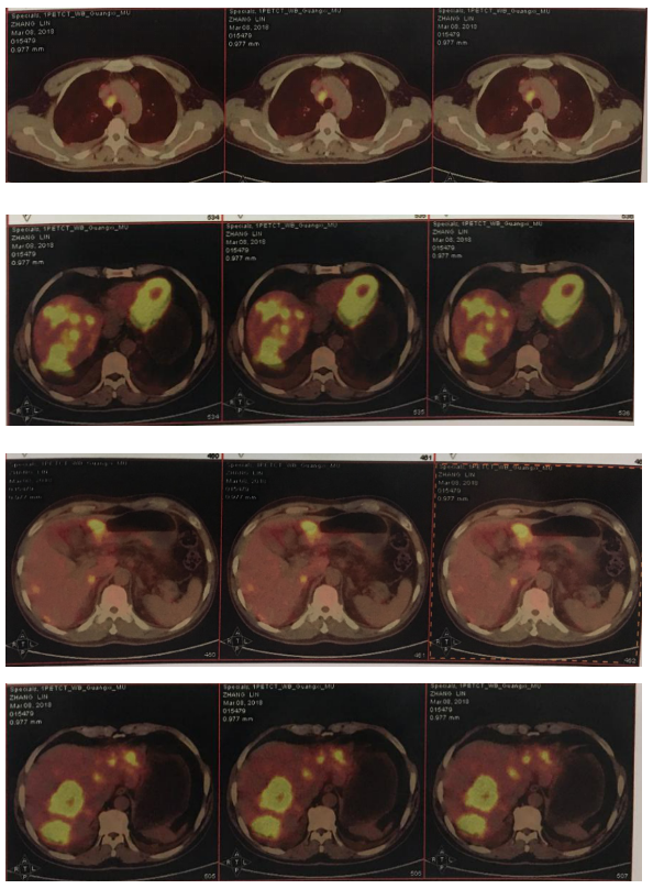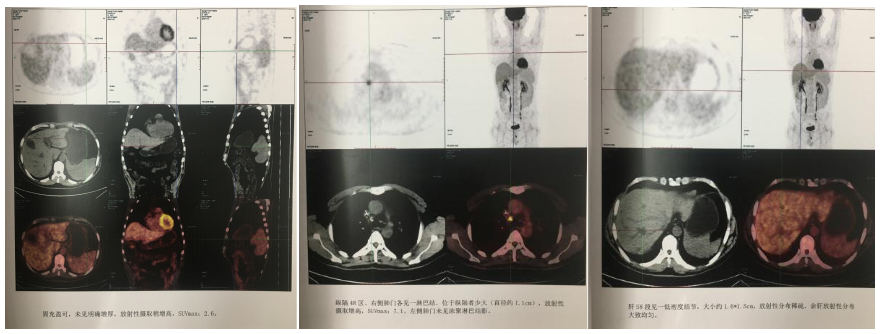 2018-03-08 PET/CT示:胃癌(?)并全身多发淋巴结转移、肝脏多发转移、双肺上叶多发转移;