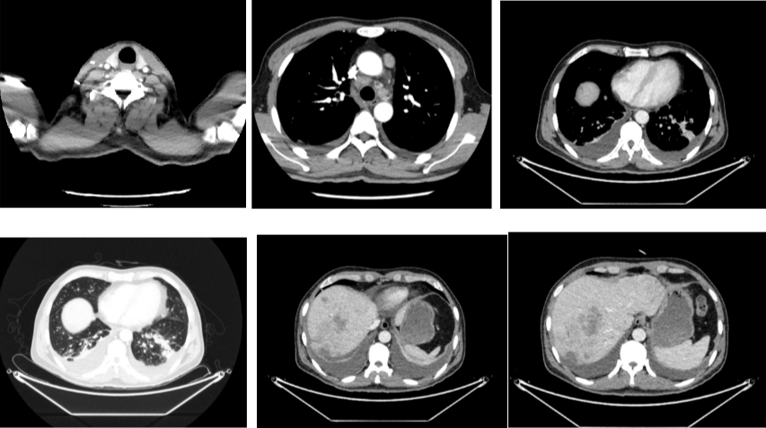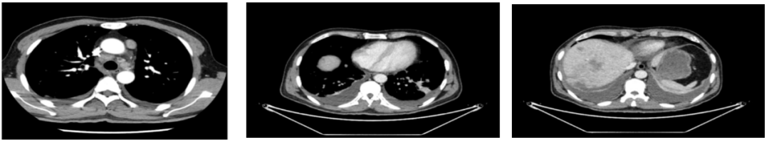 外院CT检查提示:1、两肺多发斑片状、结节影,性质待定,转移瘤?2、纵隔内多发肿大淋巴结;3、肝实质多发稍低密度影,性质待定(转移瘤可能性大)
