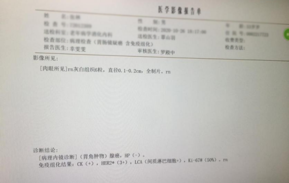 诊断:胃低分化腺癌合并肝、肺转移,并多发淋巴结转移HER2扩增