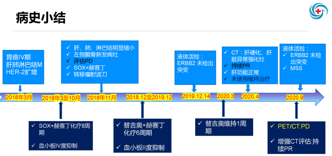 3、EVIDENCE研究显示中国人群的HER2阳性晚期胃癌,以赫赛汀与奥沙利铂/卡铂+5-FU/S-1/卡培他滨联用,OS(总体生存)较ToGA研究的要长6个月左右。【参考:Shukui Qin, et al. J Clin Oncol 37,2019 (suppl; abstr 4025)】本病历符合EVIDENCE的研究结论。