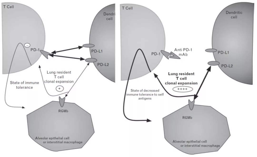 阻断PD-1,可增强PD-L2与其第二受体RGMB(排斥导向分子B)结合,导致肺炎发生