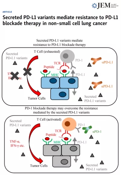 体外及动物实验发现,分泌的PD-L1变体可以捕获PD-L1抗体,阻止其与细胞膜的PD-L1结合,并使NFAT调控的信号传导失活,进而产生耐药。
