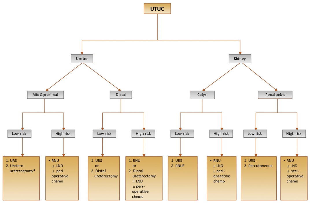 ▲2020年EAU指南根据UTUC位置和风险状况进行手术治疗决策:LND=淋巴结清扫,RNU=根治性肾输尿管切除术;URS=输尿管镜检查[1]