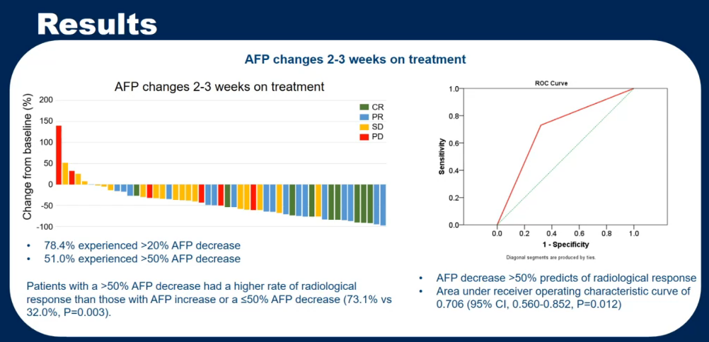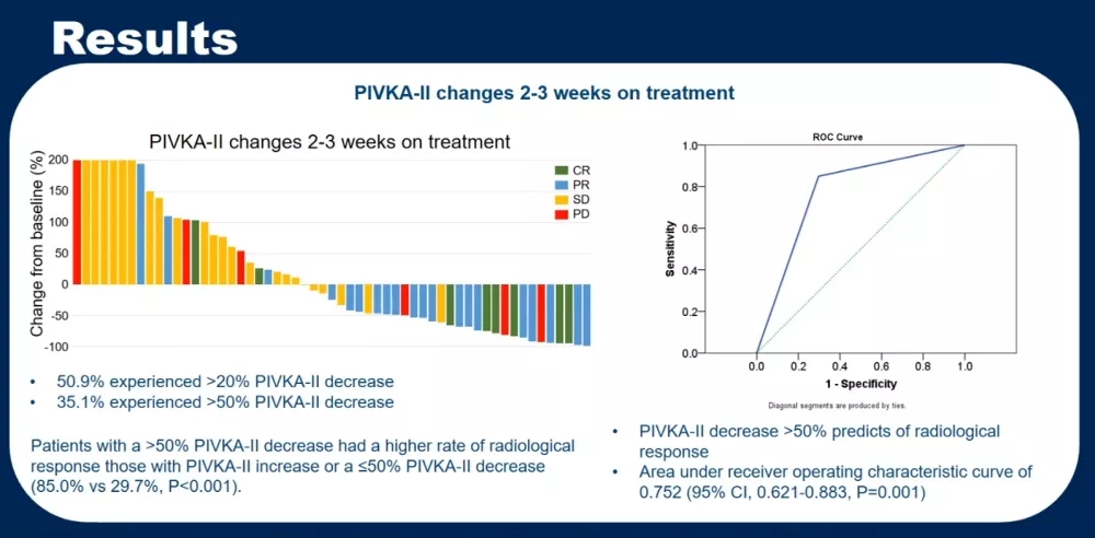 结论:联合治疗开始后2~3周,大多数患者的肿瘤标志物就会下降。治疗早期AFP或PIVKA-II下降或许可以作为接受联合抗血管生成和免疫治疗的uHCC患者客观缓解的预测因子。