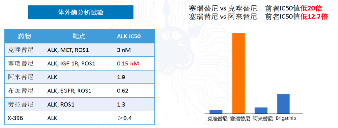 正如ASCEND-8研究结果所示,无论基线有无脑转移,塞瑞替尼一线治疗均能获得良好的疗效,究其缘由,这与塞瑞替尼相较其他ALK抑制剂更强的ALK靶点亲和力、更高的CSF/IC50比值等特性相关(图1)。