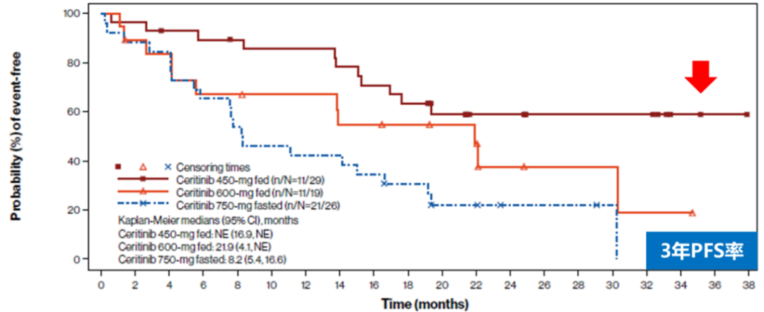 回看2020年ESMO大会上,ASCEND-8亚洲人群的长生存数据让人记忆犹新,该亚组分析结果显示,塞瑞替尼450mg随餐疗效数据卓越,随访至38个月,中位PFS仍未到达,3年PFS率达58.9%,3年OS率达93.1%(图5)。
