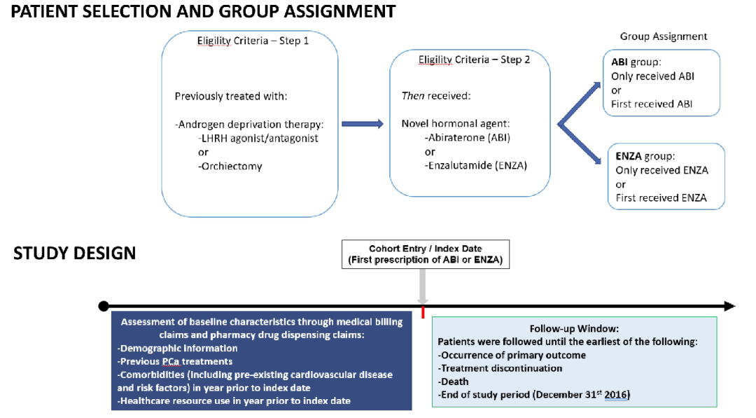 该研究回顾性分析了魁北克公共卫生管理数据库中,于2012年至2016年期间使用新型抗雄药物治疗的2183例患者(阿比特龙组1773例,恩扎卢胺组410例),主要终点是心血管相关住院率(包括急性冠状动脉疾病、脑血管疾病、心力衰竭、心律失常和其他心血管疾病的复合终点)。