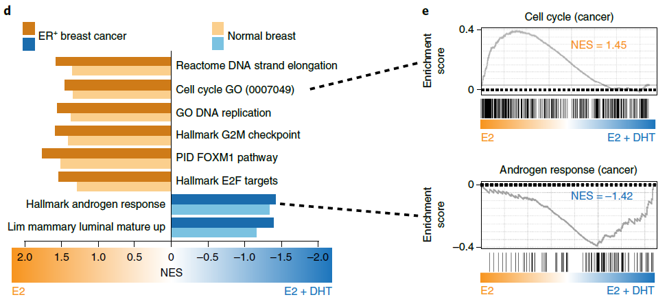 来源于乳腺癌患者的外植体(patient-derived explant, PDE)模型研究初步探究雄激素在乳腺癌细胞增殖中的作用。结果显示雌二醇(E2)单独处理的ER+PDE的Ki-67指数明显高于E2+双氢睾酮(DHT)治疗组。在BrdU检测正常和乳腺癌细胞增殖时,E2和细胞周期调节的基因呈正相关而联合DHT则呈负相关,提供了雄激素在E2暴露的临床乳腺组织中抗增殖作用的直接证据。