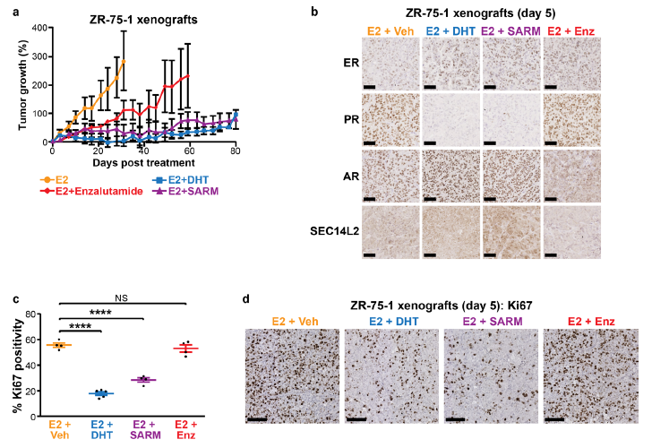 鉴于既往的研究报道AR在ER+乳腺癌治疗中出现相互矛盾的结果,那么究竟是AR抑制剂还是激动剂具备抑制肿瘤增殖的能力呢?在小鼠体内建立了ZR-75-1异种移植物,用E2刺激肿瘤生长,评估AR激活剂/抑制剂的效果。虽然恩扎鲁胺(Enzalutamide)初期能抑制肿瘤细胞的增殖,但这种情况并未持续;而两种AR激动剂(DHT,SARM)在整个90天的过程中持续抑制肿瘤生长,治疗5天后增殖指数显著降低。