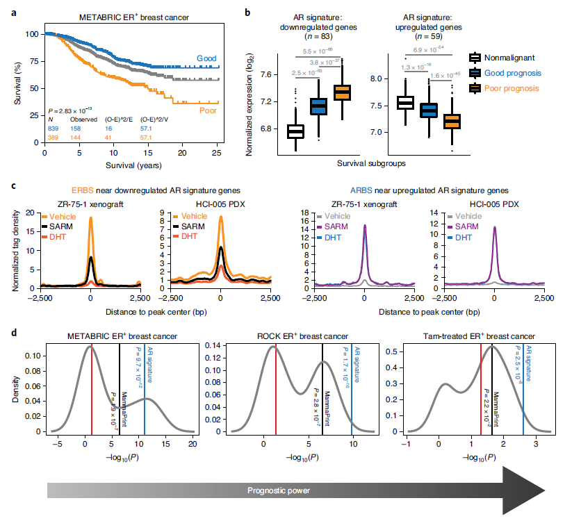 最后,作者通过整合来自多个体内模型的转录组数据产生AR活性的基因特征,将METABRIC乳腺癌队列中的ER+病例分为良好和不良结局组。通过分析上调基因和下调基因在不同结局患者中的分布。最终发现内源性AR活性在原发性ER+乳腺癌中更为显著,且与DFS延长呈正相关,并且具有显著的预后相关性。这一特征可能有助于ER+乳腺癌的预后评估,也可能有助于在将来的AR激动剂靶向治疗试验中患者的选择和治疗反应的评估。