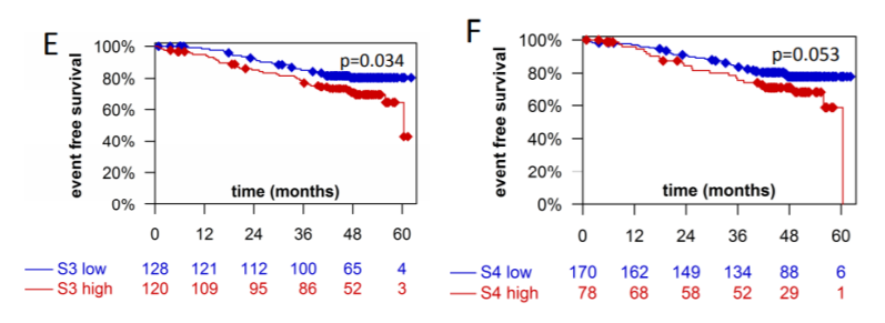 图3. 高或低S3(HRD)、S4(吸烟)突变特征HR阳性肿瘤的无事件生存率