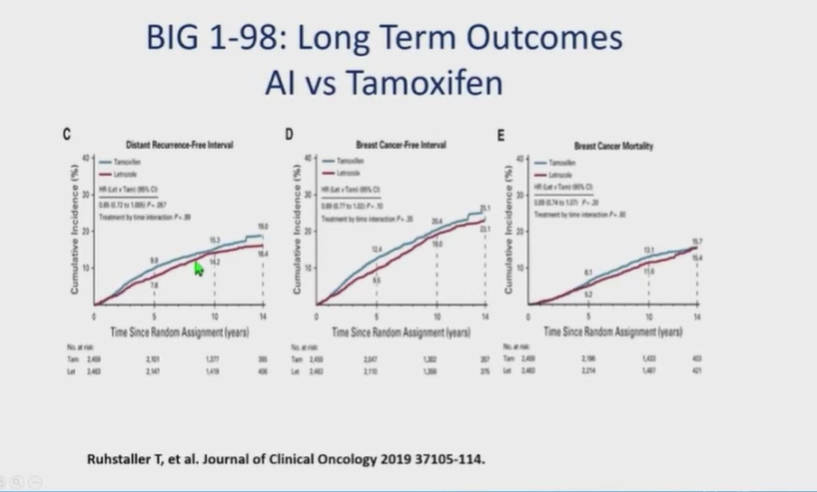 内分泌治疗过程中患者的不良反应也应引起大家重视,如心血管、骨质变化和子宫内膜变化等副反应。临床研究也为我们提供了一些治疗策略,如BIG 1-98研究提示,当患者不能耐受某种治疗策略时,可以通过转换药物治疗的手段来达到治疗效果。