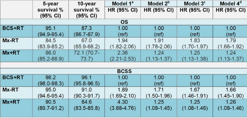 研究结论:尽管调整了先前未测量的混杂因素,BCS+RT比Mx±RT的情况下获得了更好的生存率。当两种干预对单个患者都是有效的选择时,乳房切除术不应该被认为等同于保乳手术。