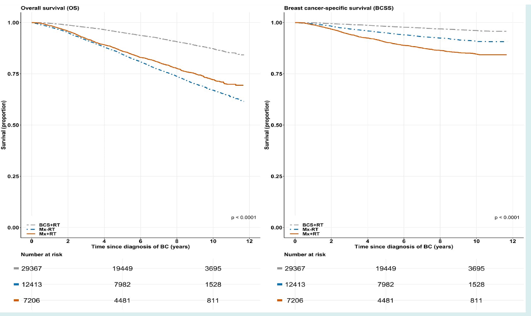 瑞典研究者前瞻性的从瑞典国家登记处收集了2008年~2017年所有被诊断为原发性浸润性乳腺癌女性(T1-2 N0-2)的临床数据、人口和社会经济数据以及合并症。有关局部治疗的完整信息是强制性的,并将这些患者分为三组:保乳手术+放疗组(BCS+RT),乳房切除术后不放疗组(Mx-RT)和乳房切除术后放疗组(Mx+RT)。使用Kaplan-Meier法和逐步调整的Cox回归模型估计总生存率(OS)和乳腺癌特异性生存率(BCSS)。