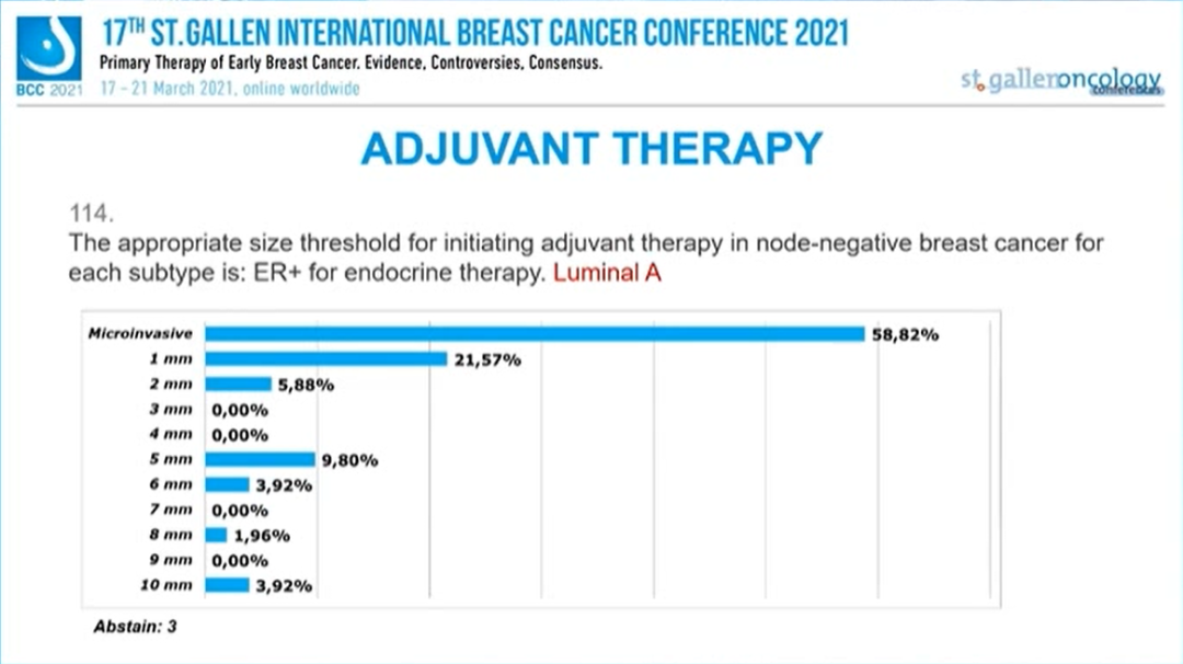 超过一半专家(58.82%)认为“微浸润”的肿瘤即需要辅助内分泌治疗,超过五分之一的专家(21.57%)的专家认为“1mm”以上的肿瘤才需要辅助内分泌治疗,另有9.8%选择“5mm”、3.92%选择“6mm”、1.96%选择“8mm”、3.92%的专家选择“10mm”作为辅助内分泌治疗的阈值。