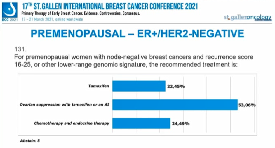 22.45%的专家选择“他莫昔芬”,53.06%选择“OFS+TAM或AI”,24.49%选择“化疗+内分泌治疗”,另有8人弃权。