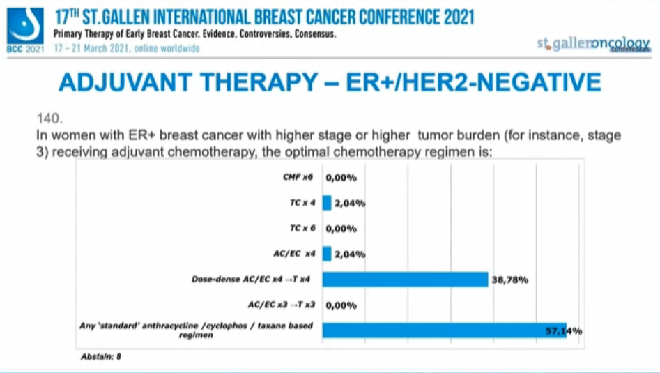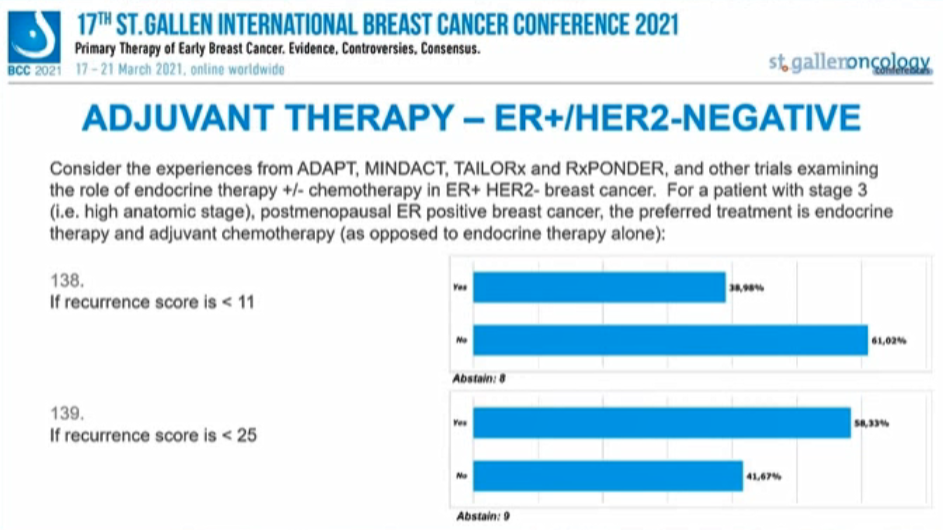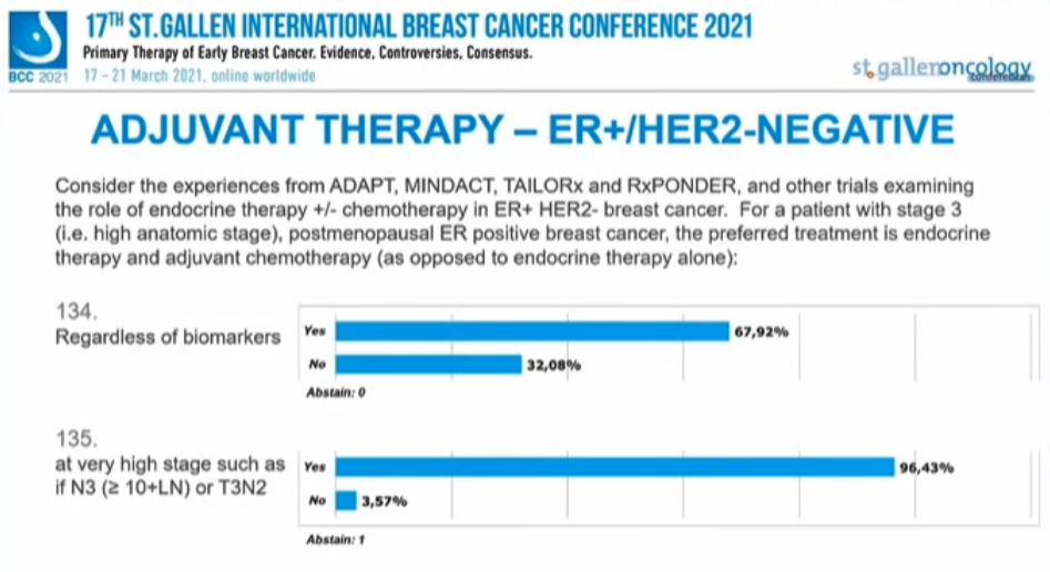 考虑来自ADAPT、MINDACT、TAILORx和RxPONDER以及其他ER+/HER2-乳腺癌内分治疗研究的经验,对于3期(如解剖学分期高)绝经后ER阳性患者的首选辅助治疗是内分泌联合化疗(与单独内分泌治疗相反):