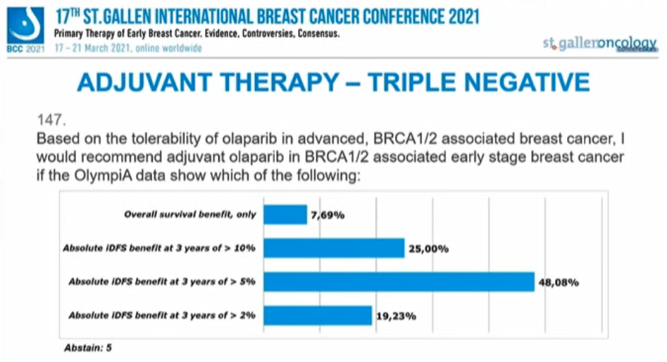 基于奥拉帕利对晚期BRCA1/2相关乳腺癌的耐受性,如果OlympiA研究显示以下哪些数据你会推荐奥拉帕利用于BRCA1/2相关早期乳腺癌的辅助治疗?