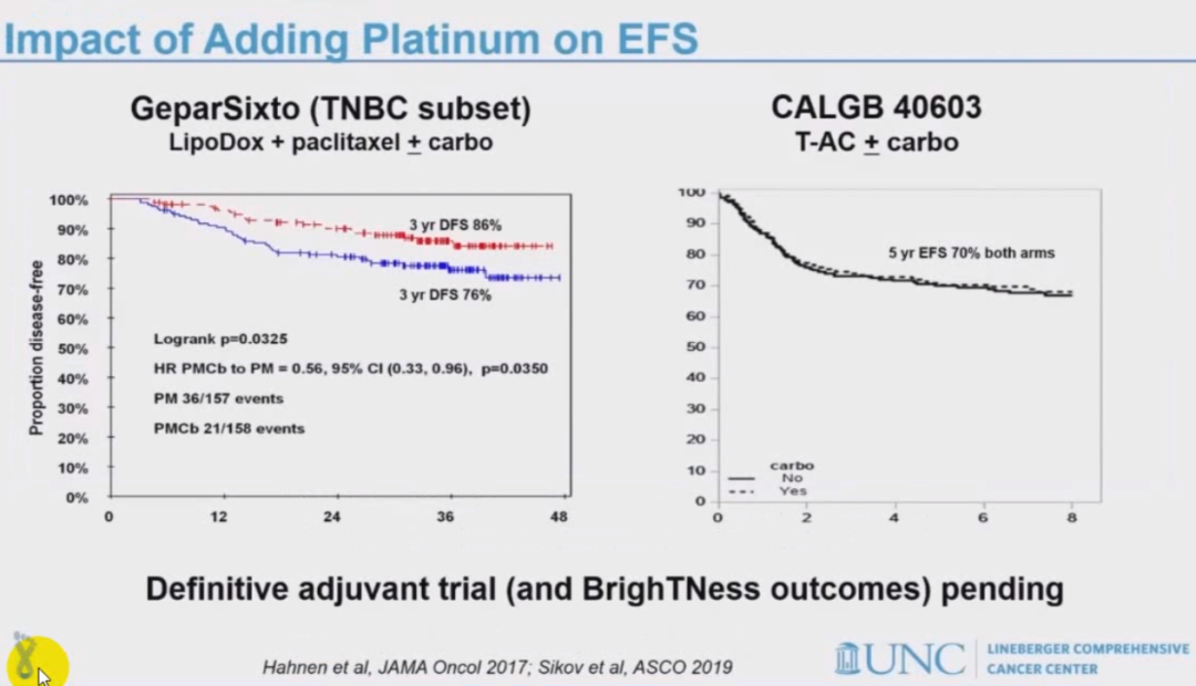 其次对于铂类的地位。在辅助治疗方面,袁芃教授回顾了我国的两项代表性研究,其一是复旦大学肿瘤医院PATTERN研究,在TNBC辅助治疗中,卡铂联合紫杉醇(PCb)6周期较CEF-T方案6周期治疗的5年DFS更优(86.5% vs 80.3% P=0.03 );其二是中国医学科学院肿瘤医院在对TNBC辅助治疗研究中,发现PCb 6周期较EC-T 8周期5年OS率类似(94.4% vs 93.5% 对数秩P=0.770),两组达到非劣效结果。因此,虑及蒽环的使用周期数,铂类在辅助治疗中替代蒽环仍有争议。在新辅助治疗方面,张剑教授提到2020年圣安东尼奥乳腺会(SABCC)对铂类是否要加入新辅助治疗决策进行投票,超过1/3的专家予以否定,还有1/3模棱两可。因为CALGB 40603研究中,TNBC亚组含铂组较非含铂组pCR改善(60% vs 46%),5年EFS却并无不同;而GeparSixto研究中含铂组则在改善pCR(59% vs 38%)的基础上也取得DFS(3年DFS率 86% vs 76%)的改善,因此铂类加入新辅助治疗转化为生存获益的道路仍有坎坷。