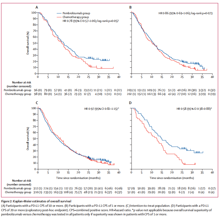 △图2:K-M估计的总生存率(A:PD-L1 CPS≥10的参与者。B:PD-L1 CPS≥1的参与者。C:意向治疗人群。D:PD-L1 CPS≥20的参与者。)