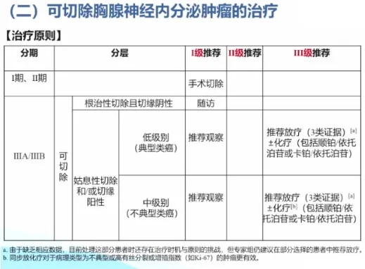 对于IIIA/IIIB期的患者,若是姑息性切除和/或切缘阳性,推荐低级别(典型类癌)患者进行术后观察,也可根据术后情况选择放疗;对于中级别(不典型类癌),术后的治疗应更积极。
