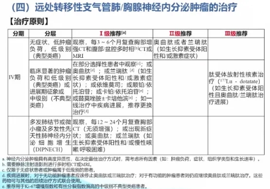 对于远处转移性支气管肺/胸腺神经内分泌肿瘤,根据不同的肿瘤负荷、症状和类型,CSCO指南给出了相应的治疗推荐。