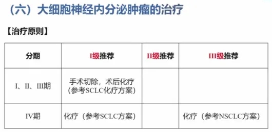 CSCO指南对于I~III期LCNEC患者,I级推荐手术切除,术后进行化疗,而IV期患者进行化疗,化疗参考小细胞肺癌的化疗方案。III级推荐中,IV期患者的化疗参考非小细胞肺癌的化疗方案。