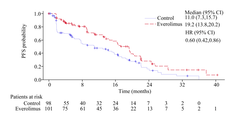 [1]Yardley DA, Noguchi S, Pritchard KI, et al. Everolimus plus exemestane in postmenopausal patients with HR(+) breast cancer: BOLERO-2 final progression-free survival analysis [published correction appears in Adv Ther. 2014 Sep;31(9):1008-9]. Adv Ther. 2013;30(10):870-884.[2]Piccart M, Hortobagyi GN, Campone M, et al. Everolimus plus exemestane for hormone-receptor-positive, human epidermal growth factor receptor-2-negative advanced breast cancer: overall survival results from BOLERO-2†. Ann Oncol. 2014;25(12):2357-2362.[3]Noguchi S, Masuda N, Iwata H, et al. Efficacy of everolimus with exemestane versus exemestane alone in Asian patients with HER2-negative, hormone-receptor-positive breast cancer in BOLERO-2. Breast Cancer. 2014;21(6):703-714.[4]Beck JT, Hortobagyi GN, Campone M, et al. Everolimus plus exemestane as first-line therapy in HR?, HER2? advanced breast cancer in BOLERO-2. Breast Cancer Res Treat. 2014;143(3):459-467.[5]Royce M, Bachelot T, Villanueva C, et al. Everolimus Plus Endocrine Therapy for Postmenopausal Women With Estrogen Receptor-Positive, Human Epidermal Growth Factor Receptor 2-Negative Advanced Breast Cancer: A Clinical Trial. JAMA Oncol. 2018;4(7):977-984.[6]Rugo HS, Pritchard KI, Gnant M, et al. Incidence and time course of everolimus-related adverse events in postmenopausal women with hormone receptor-positive advanced breast cancer: insights from BOLERO-2. Ann Oncol. 2014;25(4):808-815.[7]http://www.chinadrugtrials.org.cn/clinicaltrials.searchlistdetail.dhtml[8]Kornblum N, Zhao F, Manola J, et al. Randomized Phase II Trial of Fulvestrant Plus Everolimus or Placebo in Postmenopausal Women With Hormone Receptor-Positive, Human Epidermal Growth Factor Receptor 2-Negative Metastatic Breast Cancer Resistant to Aromatase Inhibitor Therapy: Results of PrE0102. J Clin Oncol. 2018;36(16):1556-1563.[9]Everolimus in First-line Treatment of Advanced Premenopausal Breast Cancer: Results from MIRACLE (EveroliMus Trial for Advanced PremenopausaL Breast Cancer) Study. SABCS 2019, PD7-08[10]Hortobagyi GN, Stemmer SM, Burris HA, et al. Updated results from MONALEESA-2, a phase III trial of first-line ribociclib plus letrozole versus placebo plus letrozole in hormone receptor-positive, HER2-negative advanced breast cancer [published correction appears in Ann Oncol. 2019 Nov 1;30(11):1842] [published correction appears in Ann Oncol. 2019 Nov;30(11):1842]. Ann Oncol. 2018;29(7):1541-1547.[11]Slamon DJ, Neven P, Chia S, et al. Phase III Randomized Study of Ribociclib and Fulvestrant in Hormone Receptor-Positive, Human Epidermal Growth Factor Receptor 2-Negative Advanced Breast Cancer: MONALEESA-3. J Clin Oncol. 2018;36(24):2465-2472.[12]Tripathy D, Im SA, Colleoni M, et al. Ribociclib plus endocrine therapy for premenopausal women with hormone-receptor-positive, advanced breast cancer (MONALEESA-7): a randomised phase 3 trial. Lancet Oncol. 2018;19(7):904-915.
