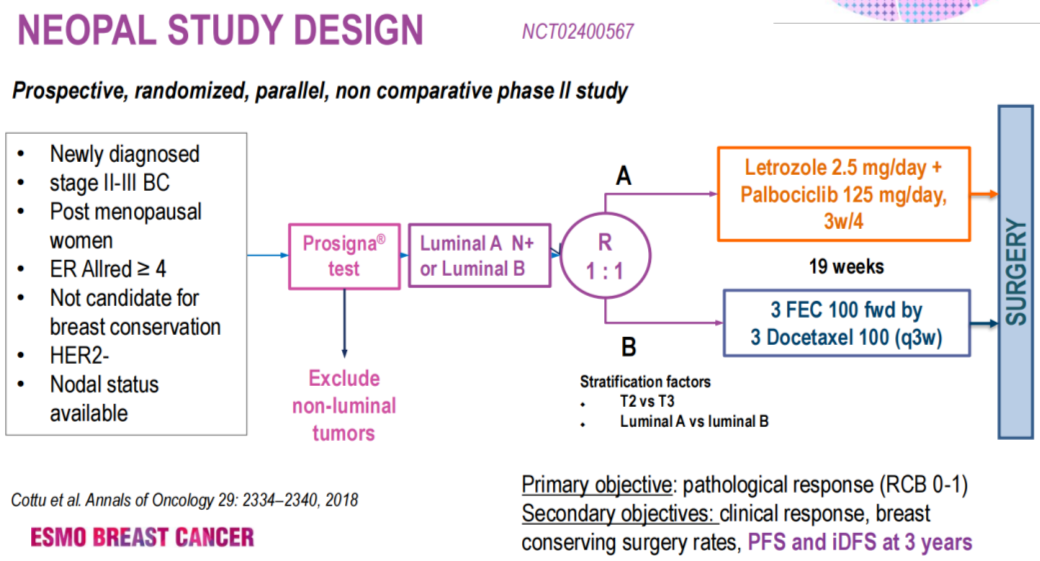 NeoPAL(UCBG104,NCT02400567)是一项随机、平行、非对照的II期研究。来自于法国和比利时22个研究中心的106名ER阳性,HER2阴性,Luminal B型或Luminal A且淋巴结阳性的II-III期绝经后女性乳腺癌患者以1:1比例随机分配到来曲唑-哌柏西利组(LETPAL)和化疗组(CT)。整个人群的中位年龄63岁,两组间的肿瘤特征很均衡,以高风险的Luminal B型为主。LETPAL组给予来曲唑(每日2.5 mg)和哌柏西利(每日125 mg,口服3周停1周);CT组给予FEC*3续贯T*3方案化疗(5FU 500mg/m2,表柔比星100mg/m2,环磷酰胺500mg/m2,多西他赛100mg/m2每3周1次),总治疗时间19周,随后进行乳房手术。主要研究终点为残留肿瘤负荷(RCB),次要终点包括无进展生存期(PFS)和无侵袭性疾病生存期(iDFS)。
