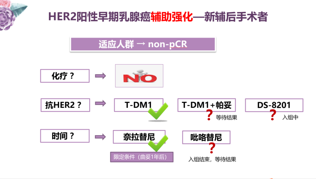 《肿瘤瞭望》:在HER2阳性乳腺癌患者的新辅助治疗中,含曲妥珠单抗的治疗方案可显著提高患者的病理完全缓解(pCR)率。对于接受新辅助治疗而未达pCR的HER2阳性乳腺癌患者,其术后辅助治疗您有怎样的建议呢?