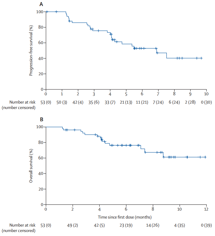 图3. HER2阳性转移性结直肠癌患者接受DS-8201治疗的患者无进展生存和总生存(队列A)