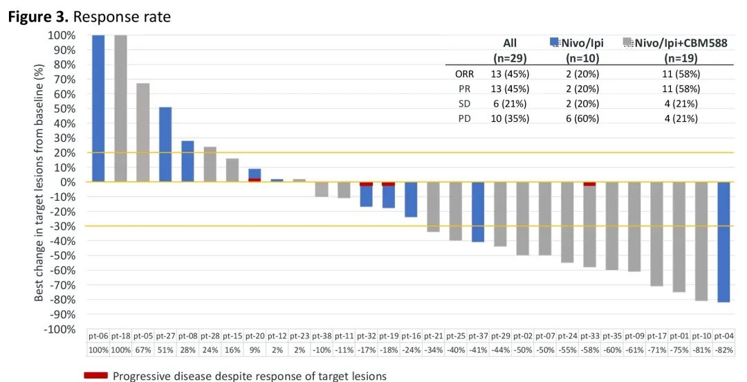 配对粪便标本的宏基因组测序显示接受N/I+CBM-588治疗的患者中Bifidobacterium bifidum和Bifidobacterium adolescentis从基线检查到第12周分别提高了8倍和6倍(图2)。丁酸梭菌仅在接受CBM-588的患者中检测出。致病菌如大肠杆菌和克雷伯菌属在未接受CBM-588治疗的患者中更为多见。接受N/I+CBM-588治疗的患者的RR显著高于单独接受N/I治疗的患者(59% vs 11%;P=0.024)(图3)。中位PFS在接受CBM-588的治疗组中延长(N/I+CBM-588:NR,N/I :11周;P<0.001)(图4)。研究组间3 / 4级毒性无显著差异(表2)。