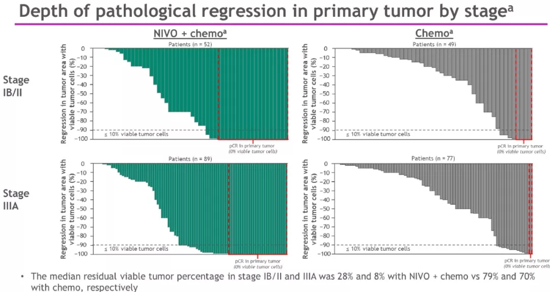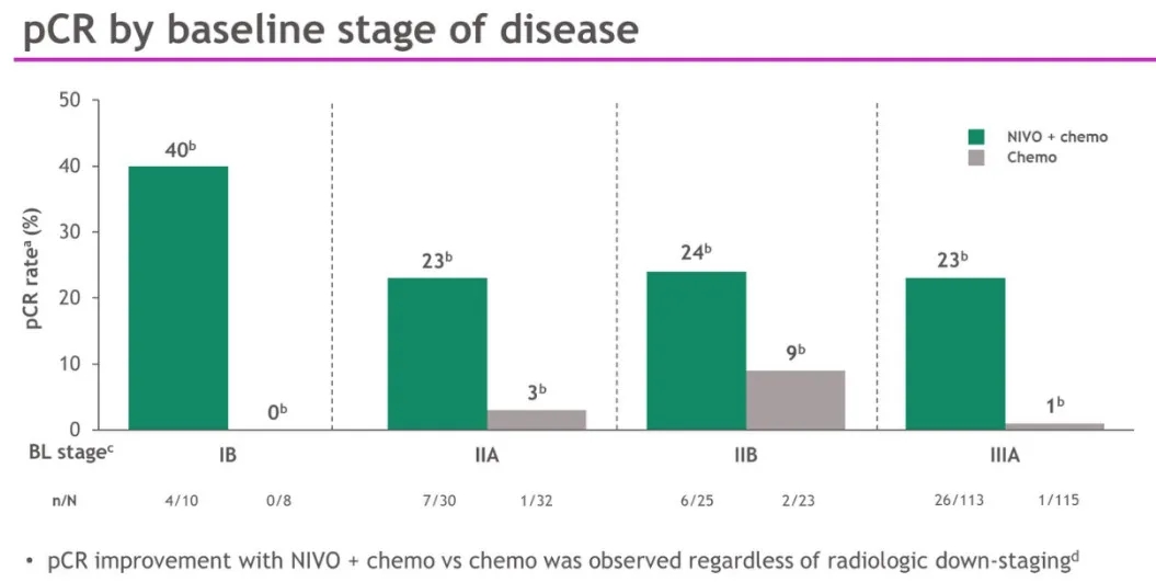 各分期患者的pCR:在IIIA期患者中,纳武利尤单抗+化疗和化疗组的pCR分别为23% vs 1%;IB期的pCR分别为40% vs 0%,IIA期患者分别为23% vs 3% ,IIB期为24% vs 9%。“CheckMate 816达到pCR的主要终点,”Spicer说。“无论疾病分期如何,患者的缓解率和病理缓解深度都有所提高;