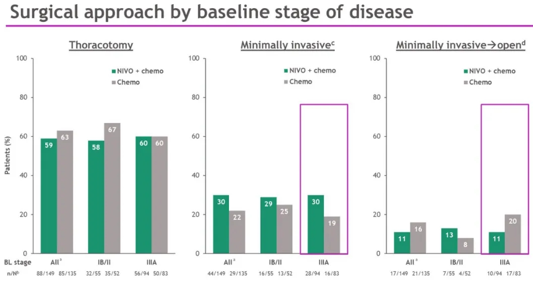 开胸手术是两组最常见的手术方式,免疫+化疗组的开胸比例59%,单纯化疗组63%。微创比例分别为30%和22%。中转开胸比例分别为11%和16%。相比单独化疗(19%;N=83),接受联合治疗(30%;N=94) 的IIIA期患者更倾向于微创手术;