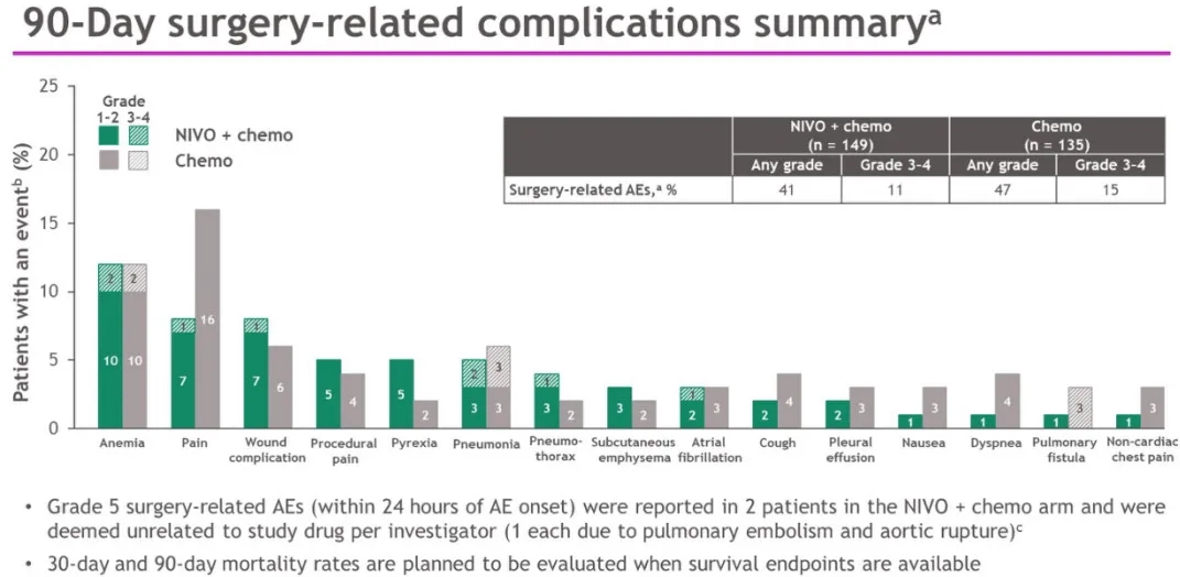安全性:纳武利尤单抗是可耐受的,加入化疗后没有增加术后并发症,没有增加手术相关的AEs,联合组和单独化疗组的手术相关的任何级别不良事件发生率为41%和42%,3/4级不良事件分别发生率11%和15%;