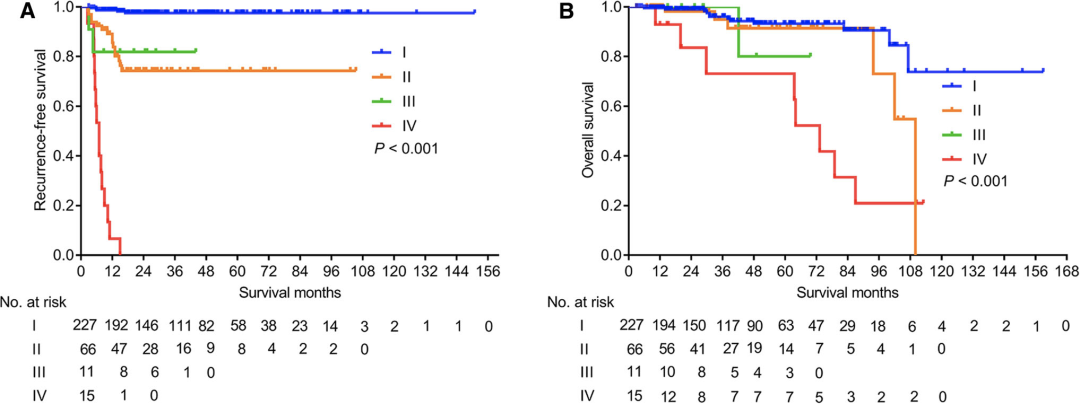 推导队列1中不同风险亚组(即I,无风险因素;II,1个风险因素;III,2个风险因素;IV,3个风险因素)患者的(a)无复发生存和(b)总生存曲线,这些风险亚组是基于以下早期复发预测因素组合而成:PanNET G3,胰管扩张和神经周围浸润