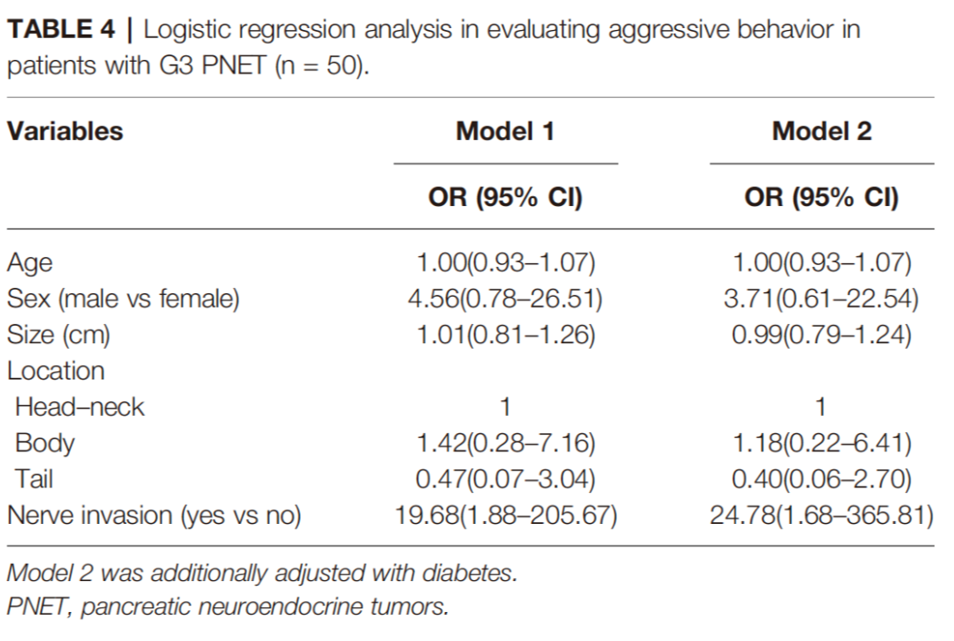 表1. Logistic回归分析评估G3 PanNET患者的侵袭行为(n=50)