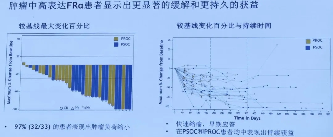 肿瘤中高表达FRa患者显示出更显著的缓解和更持久的获益。97%(32/33)患者显示肿瘤负荷变小,肿瘤50%缩小约占一半。MIRV/BEV快速缩瘤,早期应答,在铂敏感和铂耐药患者均有表现出持久获益。