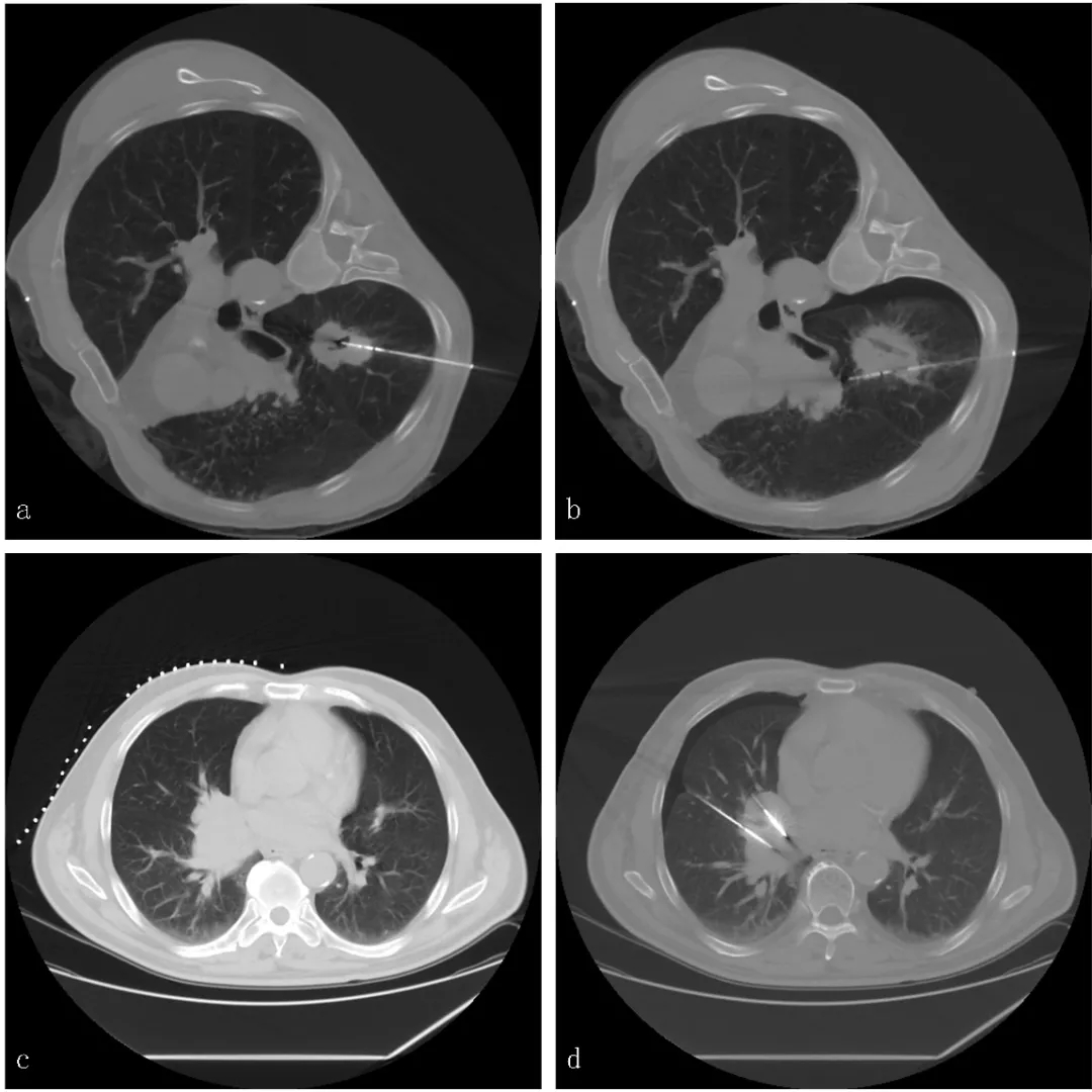 图2. 特殊类型或特殊部位NSCLC的MWA治疗。a.空洞型NSCLC的MWA治疗,首先采取中心贯穿消融,有效消融空洞内壁的肿瘤细胞;b.然后采用逐步勾边消融,覆盖病灶边缘;c.侵犯叶间裂NSCLC患者;d.采用双MWA针,进行钳形消融治疗。