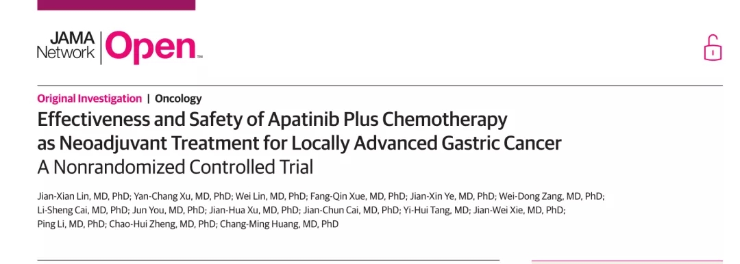 12. Jian-Xian Lin, et al. Effectiveness and Safety of Apatinib Plus Chemotherapy as Neoadjuvant Treatment for Locally Advanced Gastric Cancer: A Nonrandomized Controlled Trial. JAMA Netw Open. 2021;4(7):e2116240. doi:10.1001/jamanetworkopen.2021.16240
