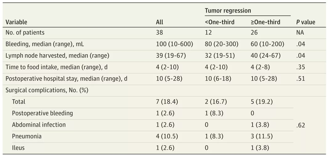 新辅助化疗似乎与手术发病率和死亡率有关。本研究中,术后并发症结果与Shrikhande等人的研究[20]一致,新辅助治疗后D2胃切除术可以安全地应用于局部晚期胃癌患者。获得病理缓解的患者失血量明显更少,淋巴结切除明显更多,这表明获得病理缓解与更好的手术结果相关。
