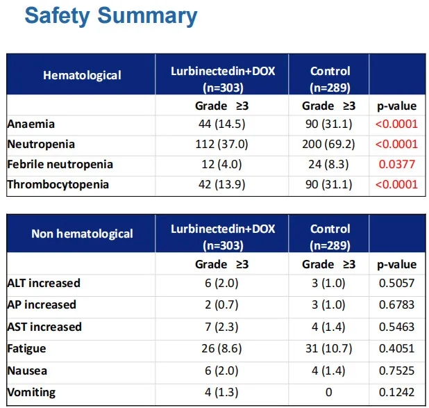 安全性:研究组(n=303)和对照组(n=289)中,88.4%的患者和92.0%的患者报告了任何级别的治疗相关不良反应(TRAE)。值得注意的是,与对照组相比,鲁比卡丁组报告的≥3级TRAE的发生率较低,分别为47.2%和75.4%。此外,鲁比卡丁比标准治疗组报告的4级TRAE发生率更低(16.2% vs 54.7%);≥3级严重AE(12.5% vs 28.7%)、与AE相关的治疗中断(7.6% vs 15.6%)和AE相关死亡(0.3% vs 3.5%)也是研究组更低。