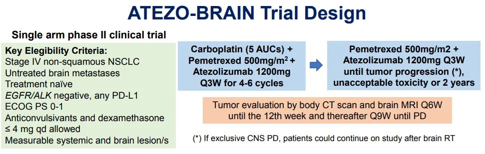 脑转移是最常见的癌症相关神经系统并发症,与生活质量和神经认知功能的负面影响以及预后不良有关。根据2021年世界肺癌大会(WCLC)报道的II期ATEZO-BRAIN试验(NCT03526900)的结果,阿替利珠单抗(Atezolizumab)联合卡铂和培美曲塞在脑转移未经治疗的晚期非鳞非小细胞肺癌(NSCLC)患者中产生了良好的安全性和有效性。