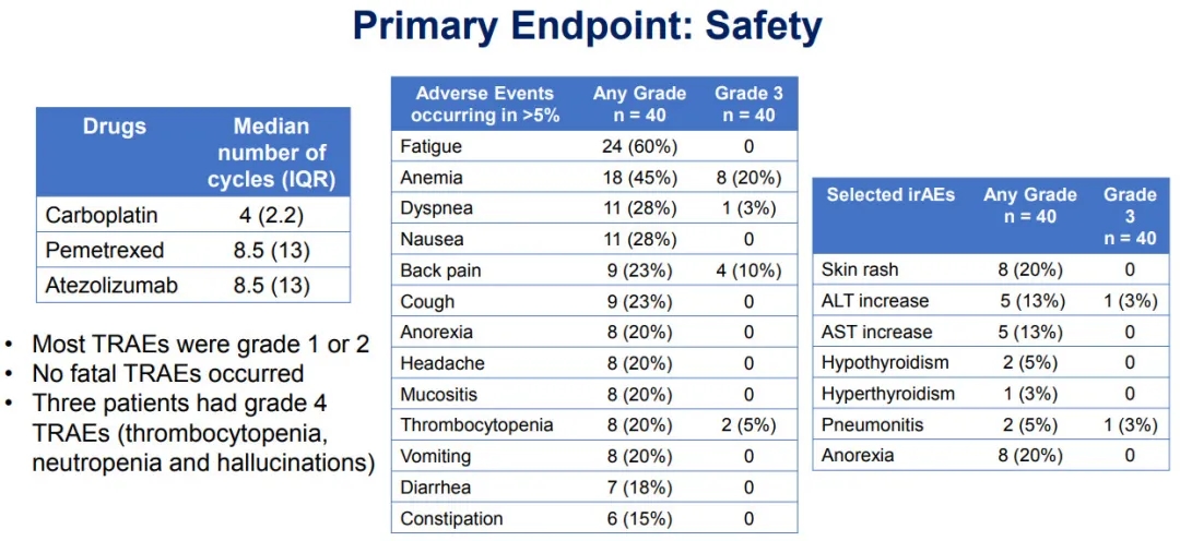 该研究在西班牙的11个癌症中心进行,利用贝叶斯统计分析安全性和有效性。研究人员确定需要40名患者的样本量,假设12周时PFS率为50%,最大3/4级毒性为35%。研究人群的中位年龄为62.6 (IQR 11.5),72.5%的患者为男性。所有患者都是白种人,75%是吸烟者或曾经吸烟者,15%从不吸烟。大多数受试者是肺腺癌(97.5%)和ECOG PS 1的患者(65%)。